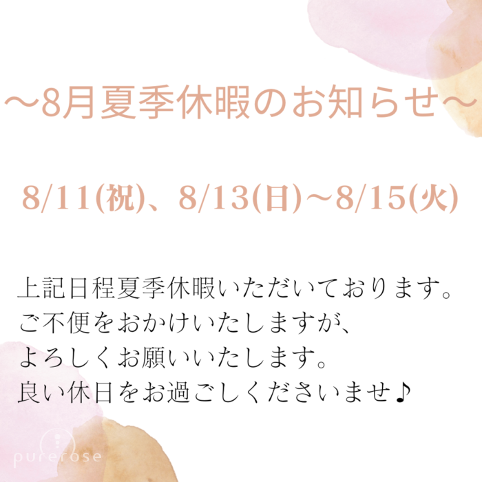 8/11(金・祝)、8/13(日)〜8/15(火)はピュアローズ大阪店、夏季休暇いただいております。