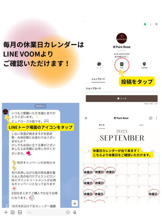 毎月の休業日カレンダーをLINEVOOMにも投稿しております。