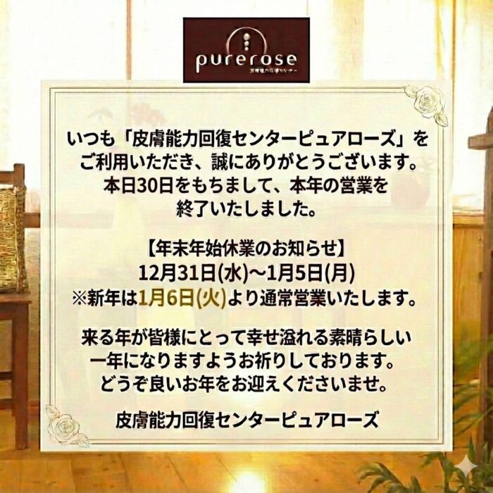 いつも「皮膚能力回復センターピュアローズ」をご利用いただき、誠にありがとうございます。 本日30日をもちまして、本年の営業を終了いたしました。 【年末年始休業のお知らせ】 12月31日(水)〜1月5日(月) ※新年は**1月6日(火)**より通常営業いたします。 (休業期間中のLINEのご予約・お問い合わせにつきましては、1月6日より順次ご返信させていただきます) 本年も沢山のご愛顧を賜り、心より感謝申し上げます。 寒さ厳しき折、くれぐれもご自愛くださいませ。 来る年が皆様にとって幸せ溢れる素晴らしい一年になりますようお祈りしております。 どうぞ良いお年をお迎えくださいませ。 皮膚能力回復センターピュアローズ大阪店